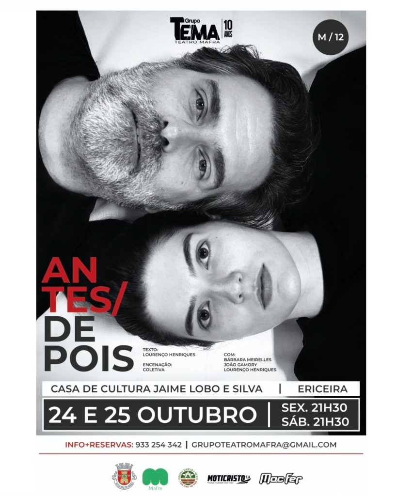 O Grupo TEMA – Teatro Mafra sobe ao palco da Casa de Cultura Jaime Lobo e Silva, na Ericeira nos próximos dias 24 e 25 de outubro, pelas 21h30, para apresentar a peça “Antes/ Depois”, uma reflexão sobre o amor, um mergulho na construção das relações, no seu desenvolvimento, no seu fim.