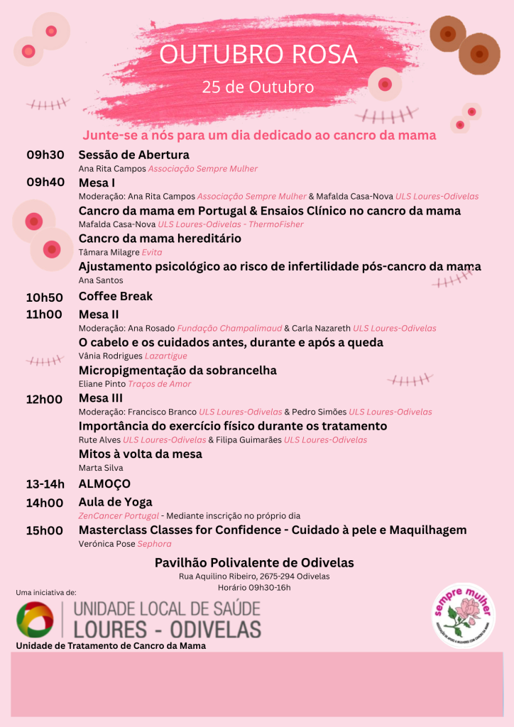 Este evento, que terá lugar no Pavilhão Polivalente de Odivelas, promete um dia repleto de atividades tais como sessões de sensibilização sobre o cancro da mama, conversas sobre exercício físico, nutrição em oncologia, impacto psicológico do risco de infertilidade e outras temáticas relevantes para quem vive ou conviveu com a doença e sessões de yoga restaurativo.