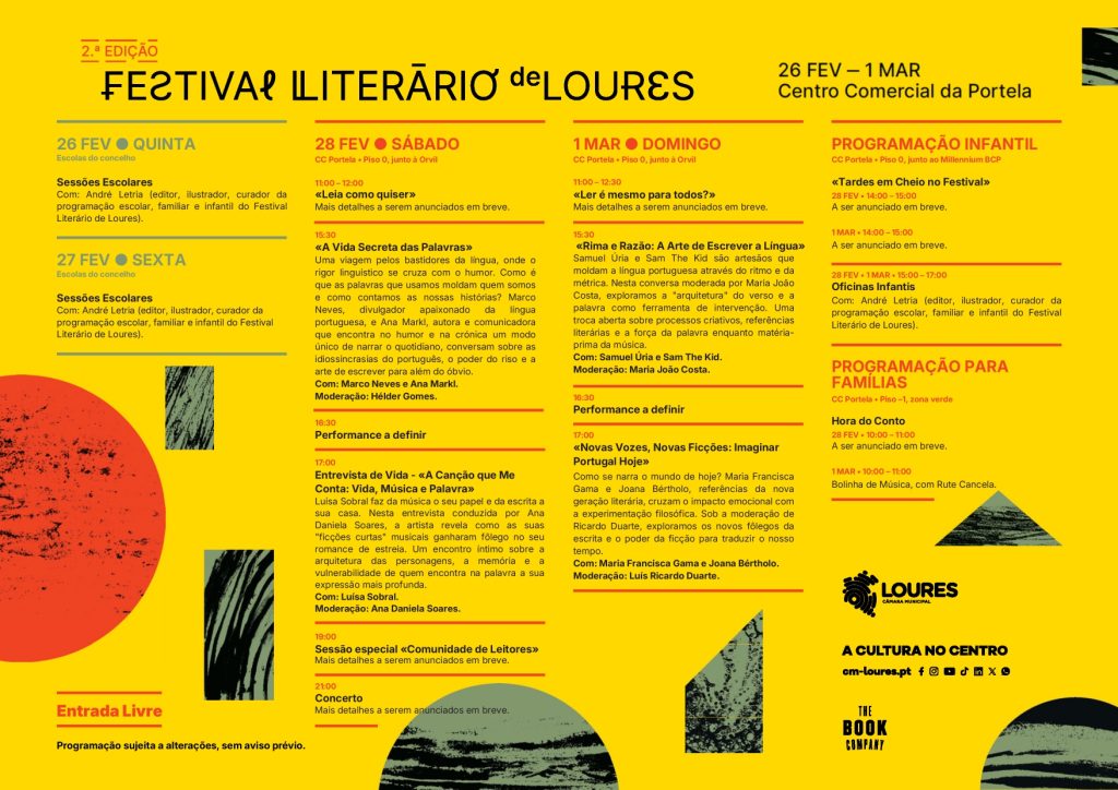 O Festival Literário de Loures está de volta para a sua 2.ª edição, prometendo quatro dias de atividades e encontros para todos os apaixonados pelas palavras. O evento decorre de 26 de fevereiro a 1 de março, no Centro Comercial da Portela, com entrada livre.