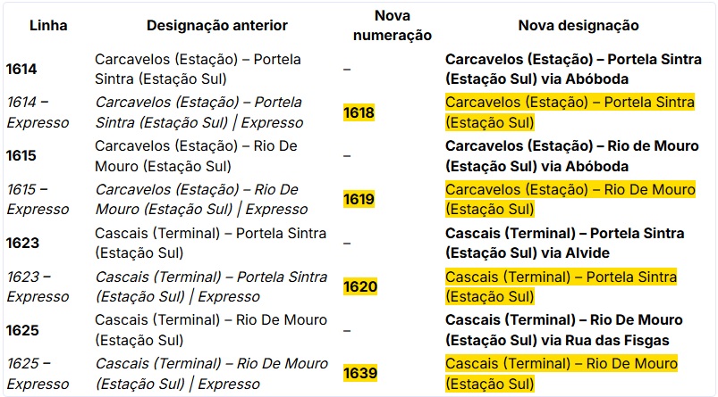 1620 | Cascais (Terminal) – Portela Sintra (Estação Sul): a linha mantém todo horário do percurso Expresso da linha 1623, mas, no sentido Portela de Sintra, os horários das 16h55 e 19h05 são ajustados para as 16h45 e 19h15, respetivamente, e, no sentido Cascais, também os horários das 8h45, 18h20 e 19h45 passam para as 8h55, 18h30 e 19h50.