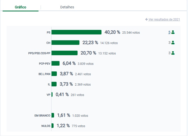 Subida do Chega que do 4º lugar em 2021 conseguiu nas eleições deste ano o 2º lugar com 22,23% e a conquista de três mandatos, mais dois que os das últimas autárquicas.