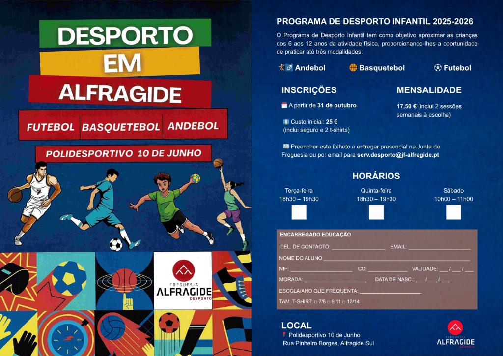 Estão abertas as inscrições para o Programa de Desporto Infantil, promovido pela Junta de Freguesia de Alfragide, para o ano letivo 2025/2026.