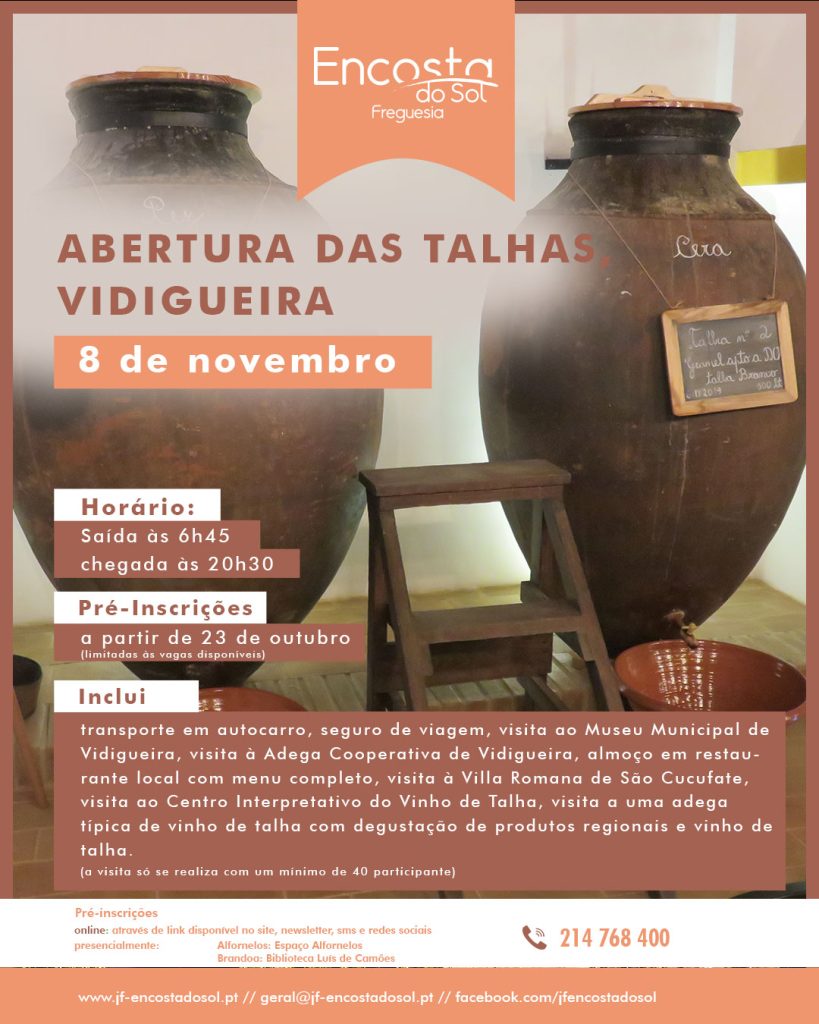 Estão abertas as inscrições para o passeio promovido pela Junta de Freguesia da Encosta do Sol à Vidigueira para a “Abertura das Talhas” a realizar no dia 8 de novembro.