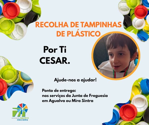 A Junta de Freguesia de Agualva e Mira Sintra associa-se à causa POR TI CÉSAR! Um menino da freguesia que nasceu com uma doença rara e precisa de fazer regularmente terapias que são pagas com a reciclagem de tampinhas. A Junta de freguesia solicita que entreguem tampinhas nos serviços da junta de freguesia em Agualva ou Mira Sintra.