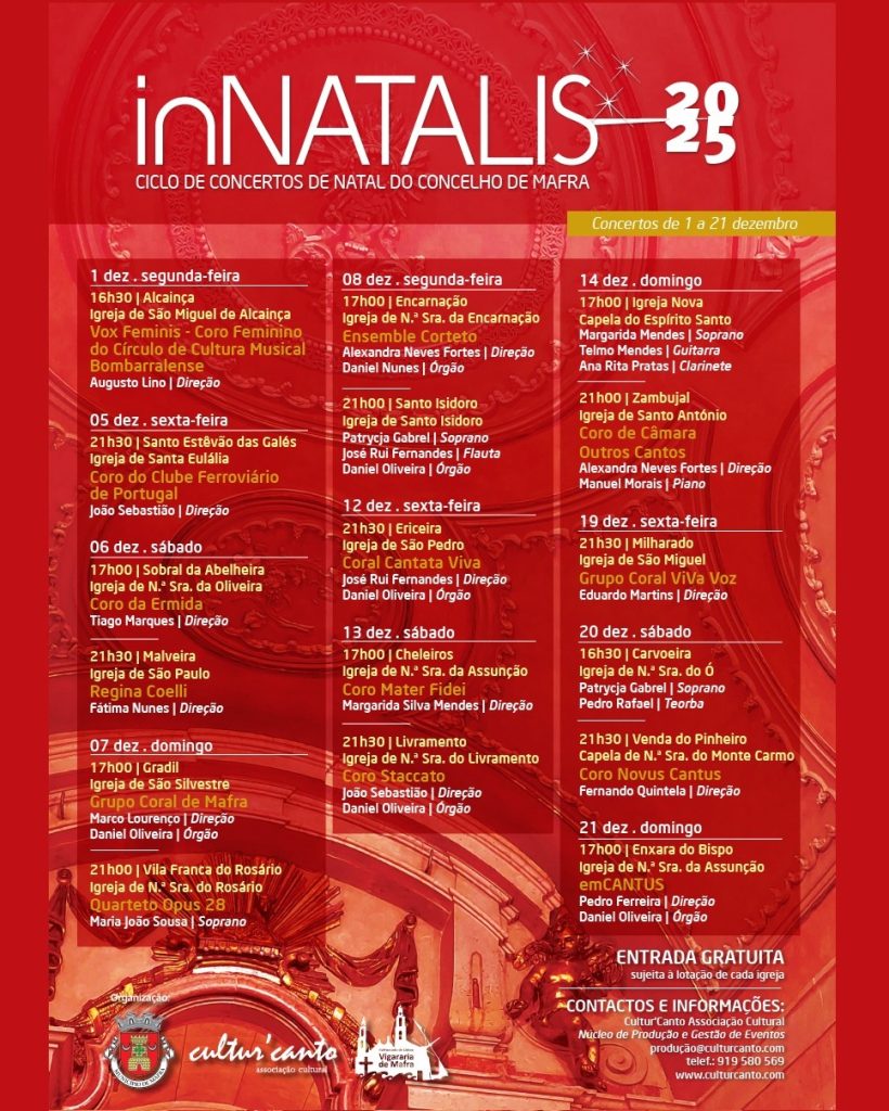 A magia do Natal vai espalhar-se por todas as freguesias do concelho de Mafra ao longo do mês de dezembro. Entre os dias 1 e 21 de dezembro, regressa o In’Natalis – Ciclo de Concertos de Natal, um evento que promete levar a igrejas e capelas do concelho diversas canções natalícias.