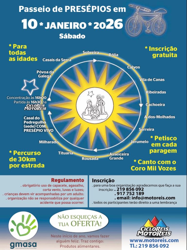 No próximo dia 10 de janeiro, volta-se a cumprir a tradição em Mafra com o Passeio de Presépios em bicicleta, uma iniciativa organizada pelo Cicloreis Motoreis, aberta a participantes de todas as idades e com inscrição gratuita.