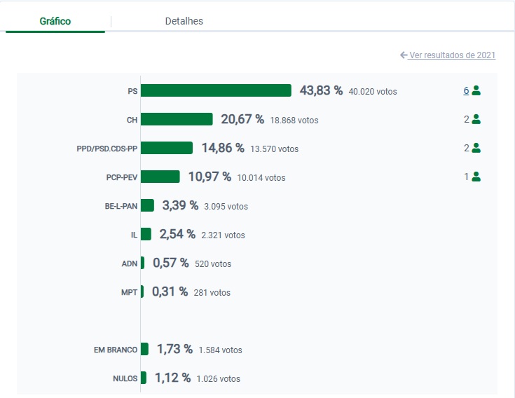 Chega foi segundo com 20,67% dos votos e dois vereadores. O mesmo número de vereadores foi conseguido pela coligação PPD/PSD-CDS-PP com 14,86% seguido da CDU com 10,97% e a conquista de um vereador na Câmara.