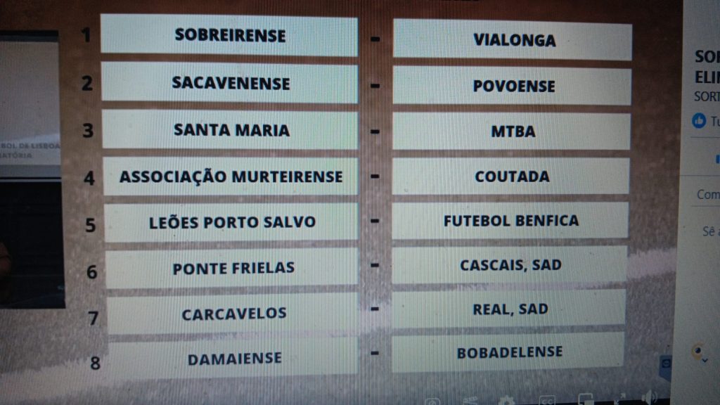 Jogos dos oitavos de final da Taça da AF Lisboa: Sobreirense (3.ª Divisão)-Vialonga (2.ª), Sacavenense (1.ª)-Povense (1.ª), Santa Maria (1.ª)-MTBA (2.ª), Murteirense (1.ª)-Coutada (2.ª), Leões de Porto Salvo (3.ª)-Futebol Benfica (1.ª), Ponte Frielas (2.ª)-Cascais SAD (2.ª), Carcavelos (2.ª)-Real SC (1.ª) e Damaiense (2.ª)-Bobadelense (2.ª).