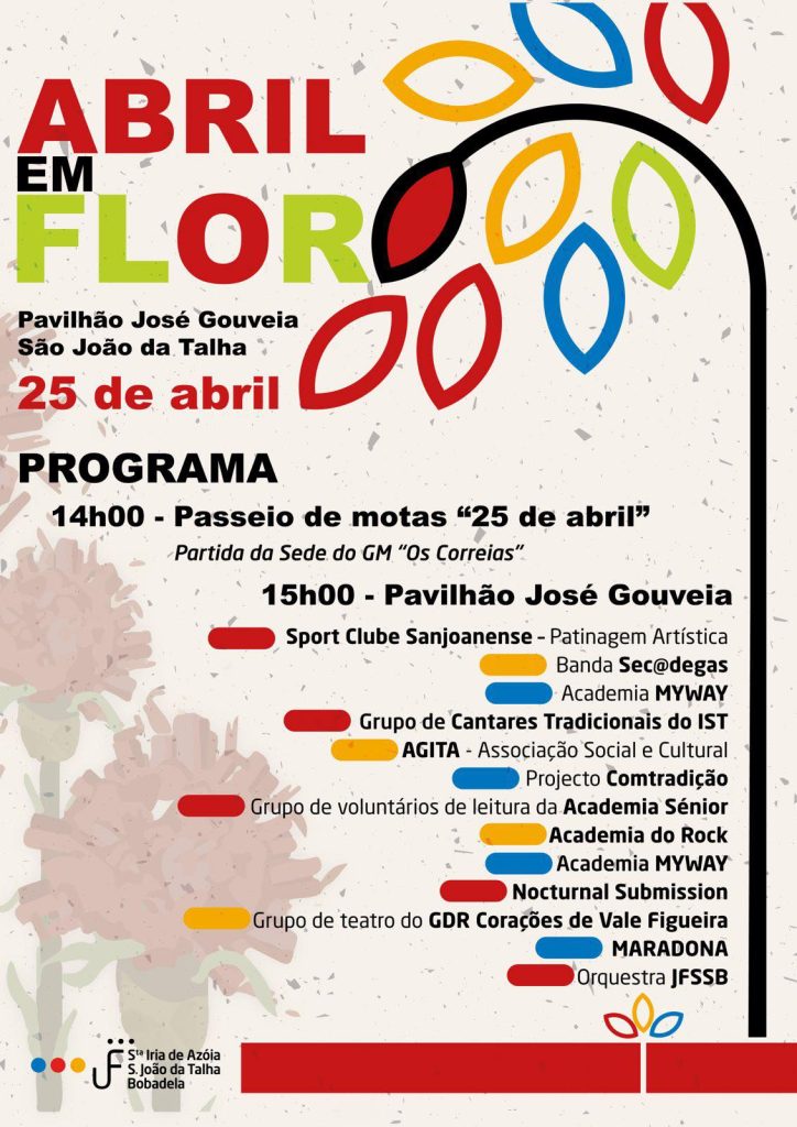 O Pavilhão José Gouveia, em São João da Talha, no concelho de Loures, vai receber no próximo dia 25 de abril o festival “Abril em Flor”, um evento que assinala a Revolução dos Cravos com um programa diversificado que junta desporto, cultura e animação musical.