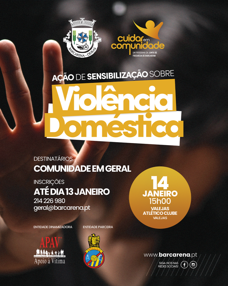 Integrado no Programa “Cuidar em Comunidade”, iniciativa da Junta de Freguesia de Barcarena, realiza-se na próxima quarta-feira (14/1), nas instalações do Valejas Atlético Clube, uma Ação de Sensibilização sobre Violência Doméstica.